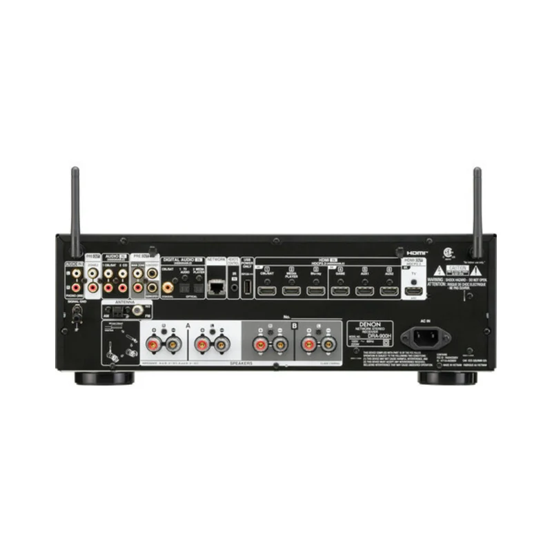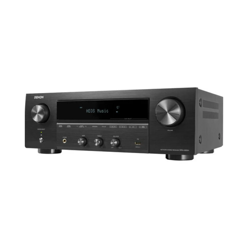 The Denon DRA-900H is a 2-channel network A/V receiver delivering 100 W per channel with 8K video support, HEOS multi-room streaming, and Hi-Res audio. It offers Wi-Fi, Bluetooth, AirPlay 2, and voice control via Alexa or Google Assistant, making it a versatile hub for music, movies, and gaming.