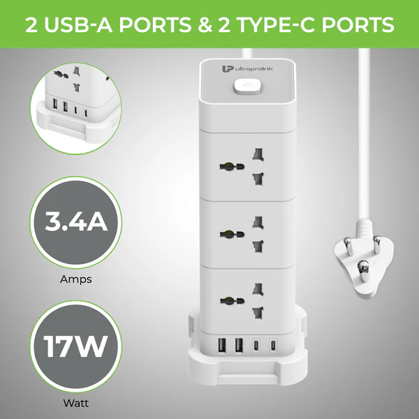 - The PowerTower UM1190U is a tall extension-board / surge-protector tower featuring 12 universal AC sockets and 4 USB ports (2 USB-A + 2 USB-C) for charging multiple devices at once.