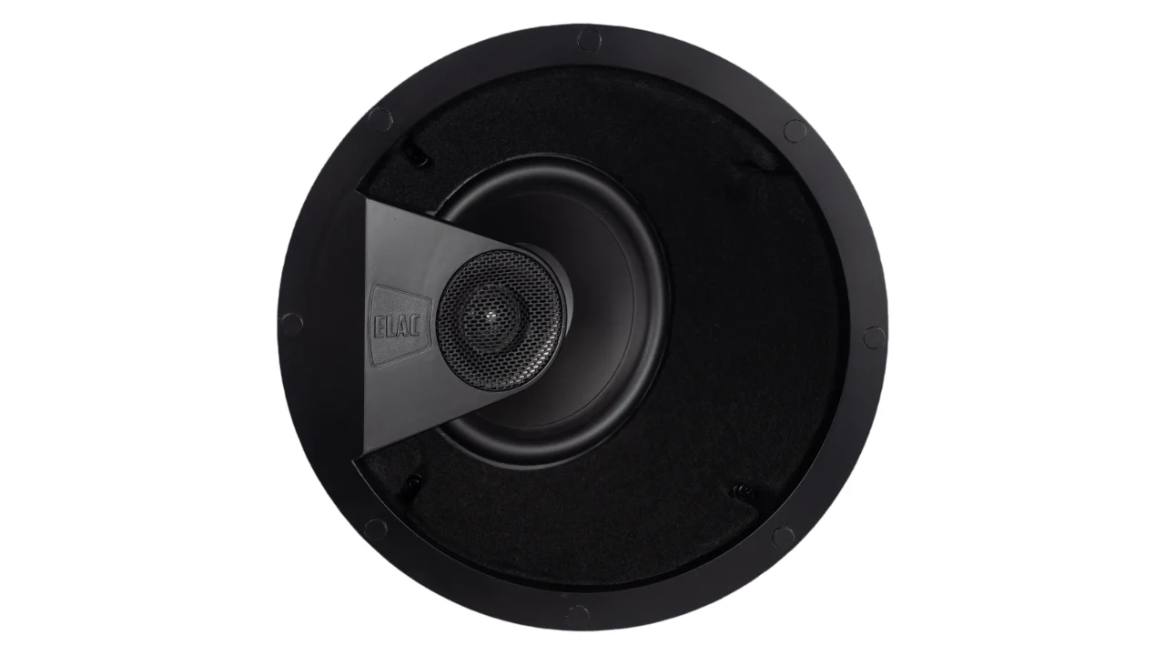 The IC-VT61W is a 6.5-inch, two-way in-ceiling speaker from the ELAC “Vertex I” series designed for home theatre and music listening, featuring both a woofer and a tweeter in a dedicated angled baffle. It incorporates a 30° angled driver module (woofer + tweeter) which enables the sound to be directed toward the listening area—enhancing imaging and soundstage compared to a flush-mounted ceiling unit.