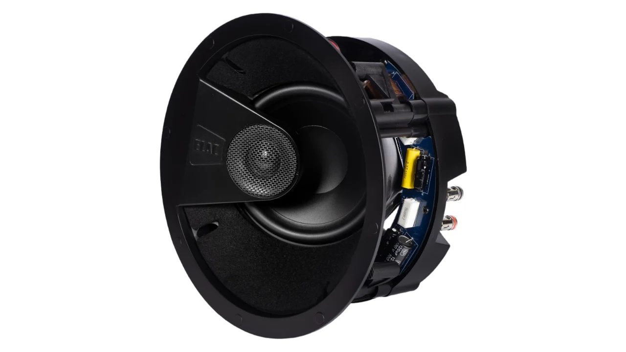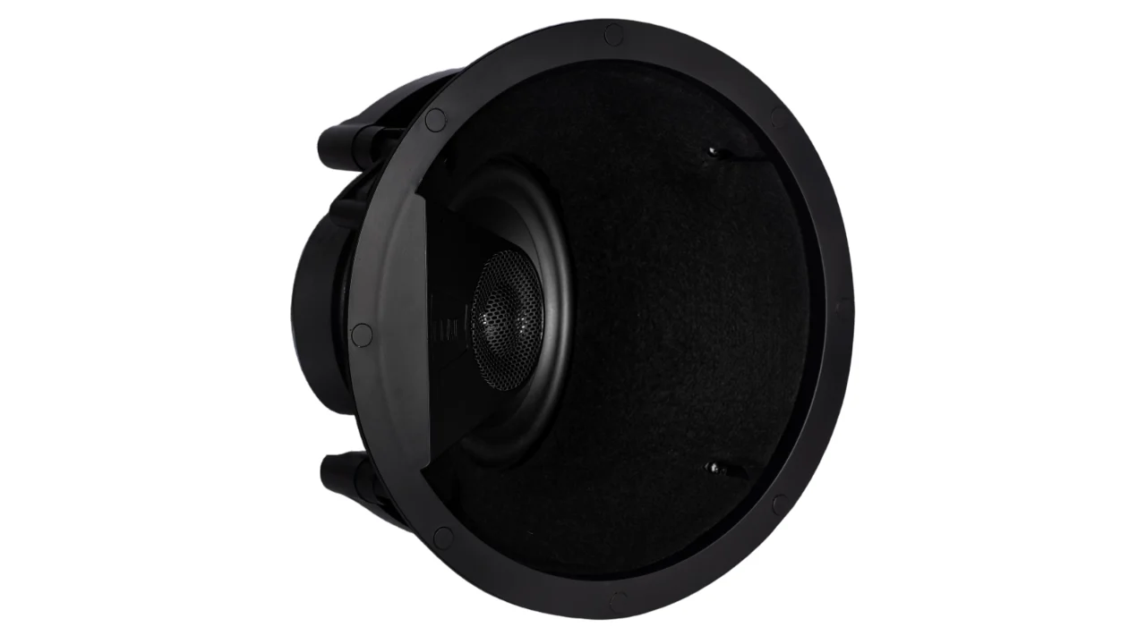 The speaker uses a 1″ soft-dome tweeter and a 6.5″ polypropylene cone woofer, together with a custom multi-element crossover aimed at smooth driver transitions and extended frequency response. The included grille is paintable and magnetic, and the overall design is intended to virtually “disappear” into the ceiling for minimal visual impact, making it suitable for home theatre installations where aesthetics matter.